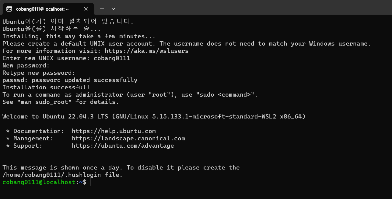 성공하면 로그인이 된다. 내 컴퓨터에 Linux(Ubuntu 22.04.3) 가 성공적으로 설치되었다.