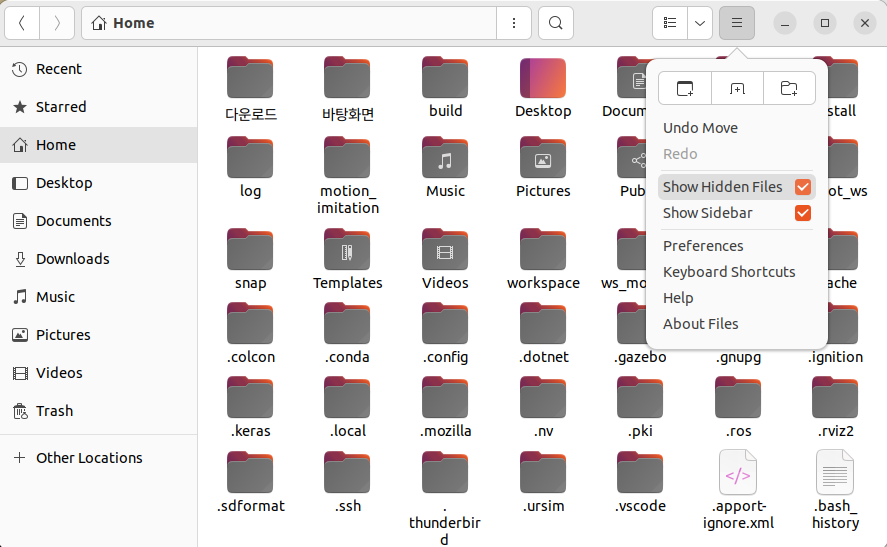 home 디렉토리로 이동해서 Show Hidden Files 옵션을 체크해 .gazebo 파일에 들어가줍니다.
