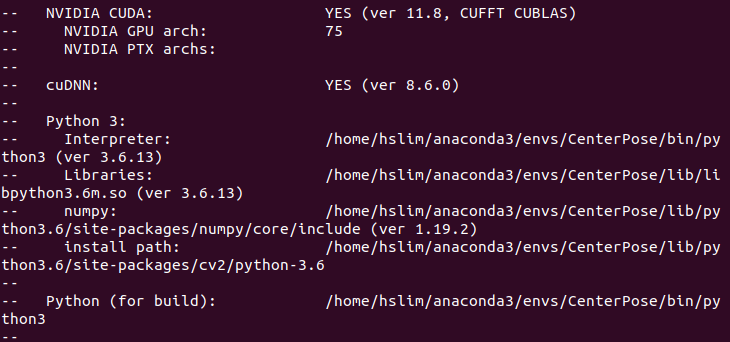 CUDA 가 ON 이고, 여러 python 경로와 lib 경로가 cmake에서 원하던대로 설정이 되었는지