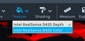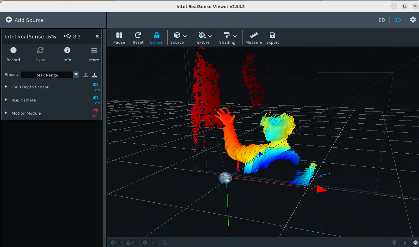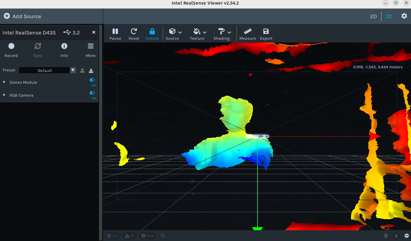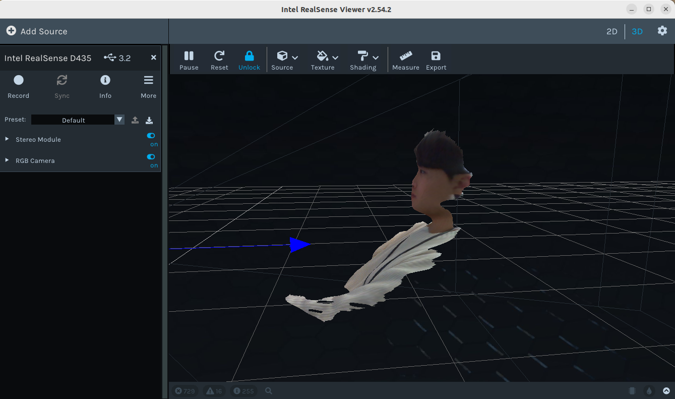 우측 상단에 3D 로 전환하면 Depth camera 화면이 3d 공간에 나타나게 됩니다.