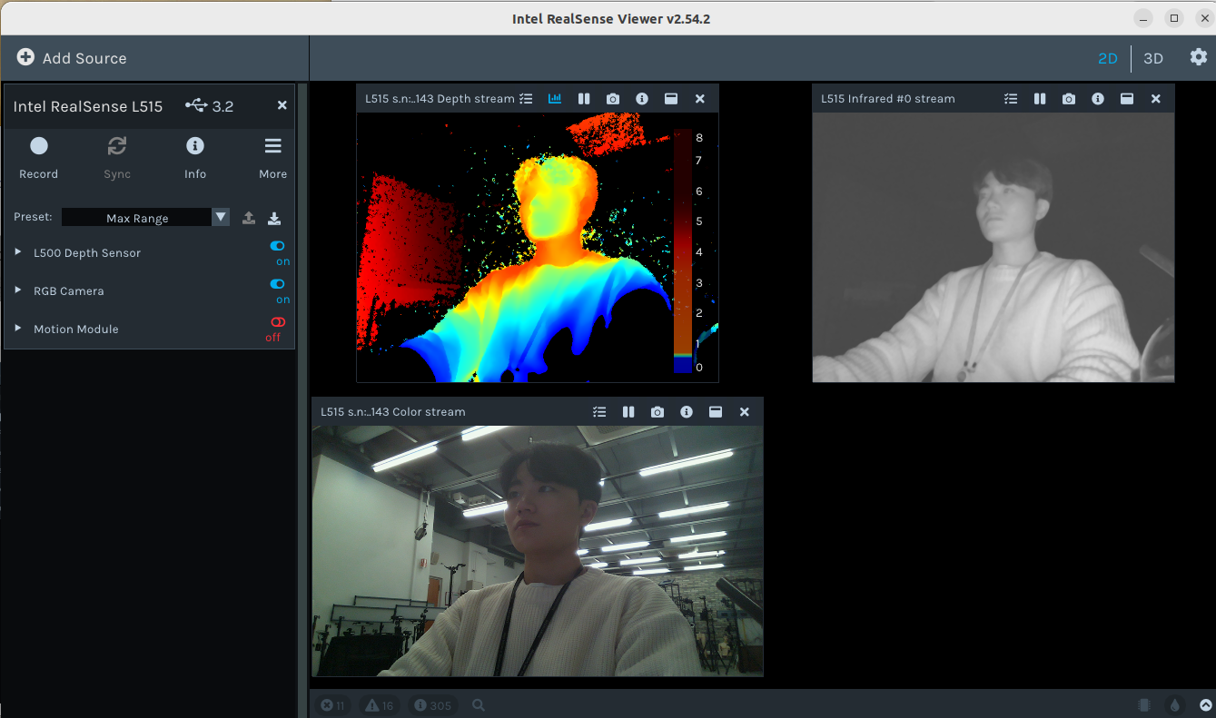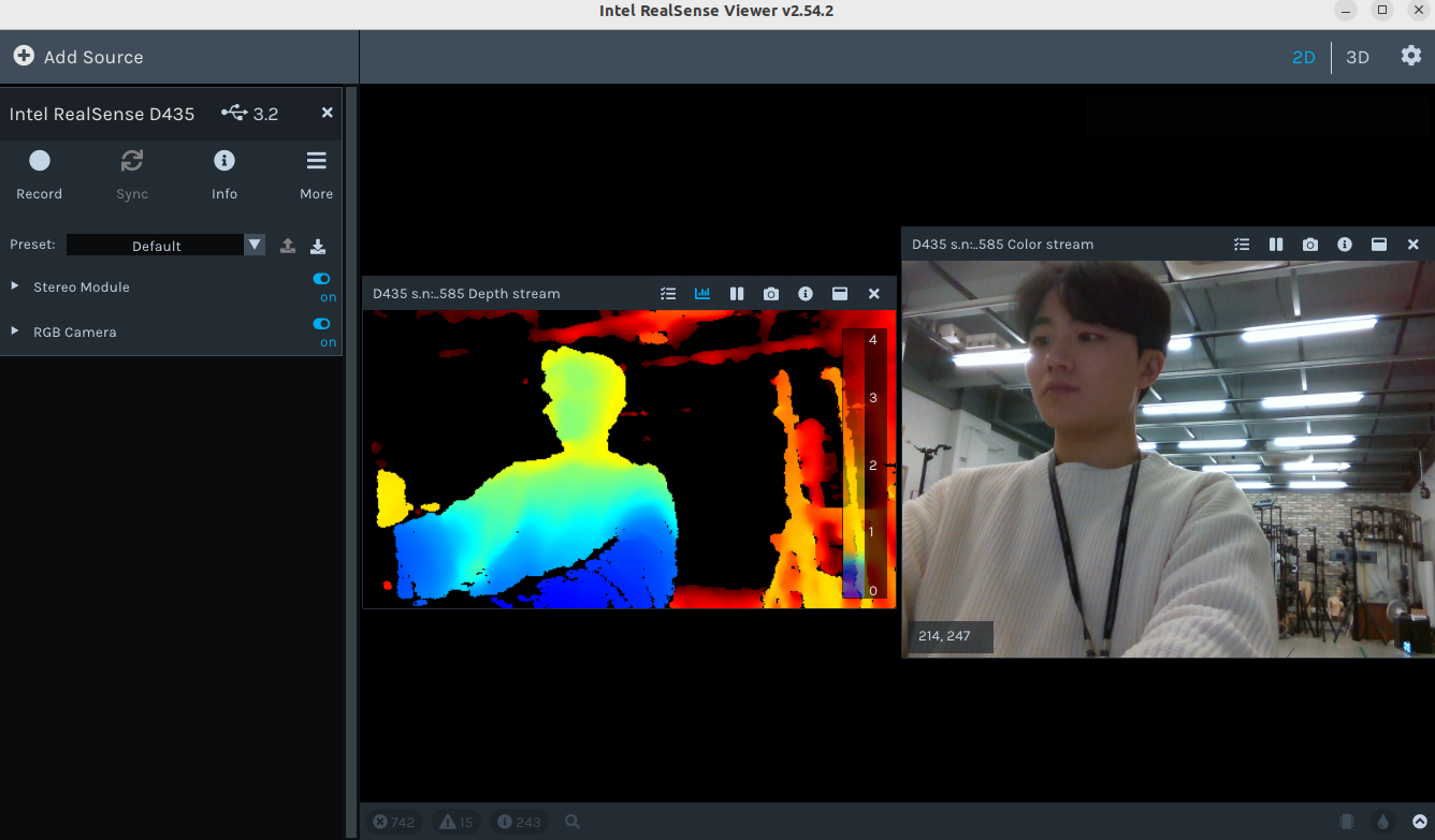 Depth Sensor 를 켜니 Depth camera와 함께 infrared stream 가 나타납니다.