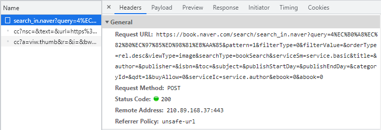 이 경우 관리자도구(F12)의 네트워크를 통해 해당 url을 확인할 수 있다.