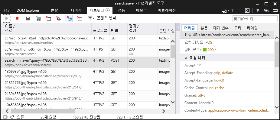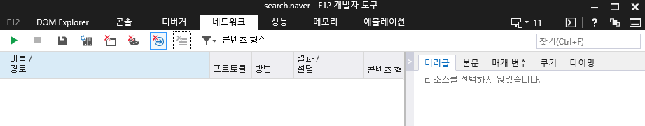 크롬의 경우 관리자도구에서 네트워크를 선택하고