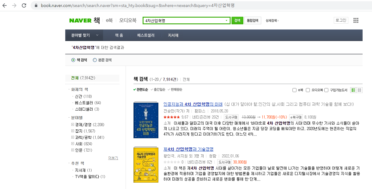 예를 들어서 네이버 책에서 4차산업혁명을 검색했을 때,